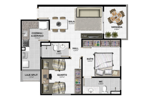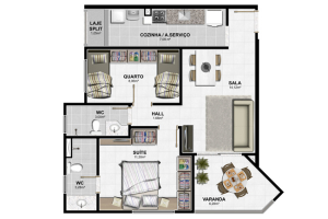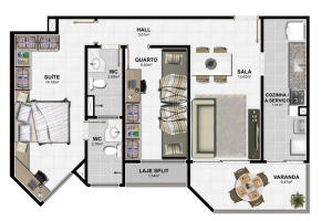 - 2 quartos sendo 1 suítes. 60,74m²